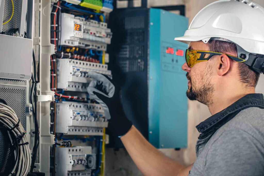 Man, an electrical technician working in a switchboard with fuses. Installation and connection of electrical equipment. SSUCv3H4sIAAAAAAAACpyRz27DIAzG75P2DhHnRiIlS0hfpdrBENqgEqiAdJqqvvv4EyrOu+Gf7c/+zPPzo2kQAyc5OjXPGIVYKrU5b8FLowPGh51boWdha/KwZMA1ELP0xkpQNWTg+aJhFQHqTamIXymJnAe/OeHi9B1x8OIaNDJ8S+QVzzluSiIlQ0dIIXSomNtYYgVl8X915sd3cQNXoflvWrgyYoUSkI2ccym6/Xhh19oabLM0lauH4aBiAamU7lZyqa9Vm/FLOntp42bT3sYV3psjZcwdmIonvgRNUfgCzoXyufBqEA+fbNZqjjY+GdhV0Rx+IoYdIZgOI+37CXcTplO3F+TfW2TQSesUoRDzm5xr6zJugPgXDIQejy0bR9r2pMcto/jSdpT3Az8OjJEpHP71BwAA//8DABp6HrOYAgAA